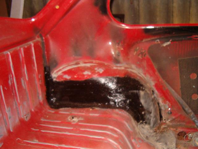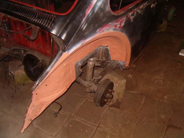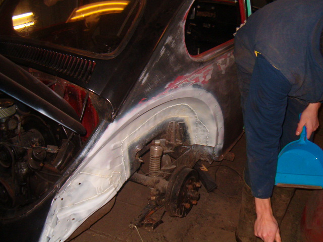 Omdat er nog een bus bitumen in de kever lag toen we hem kochten, hebben we dat ook maar even uitgeprobeerd. En hebben we bij de achterspatborden op de lasnaden gesmeerd, zodat dat er ook weer netjes uit ziet!