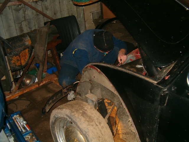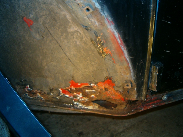 Toen we de meeste onderdelen eraf hadden gehaald, zijn we begonnen met het opzoeken van de verrotte plekjes. Tijdens het ophalen van de kever hadden we al een paar ondekt. Onder andere op de plaats waar de kriksteunen zitten. En nog een paar plekjes in de bodemplaten. En Links achter bij het spartbord was het vrijwel helemaal weg gerrot.
