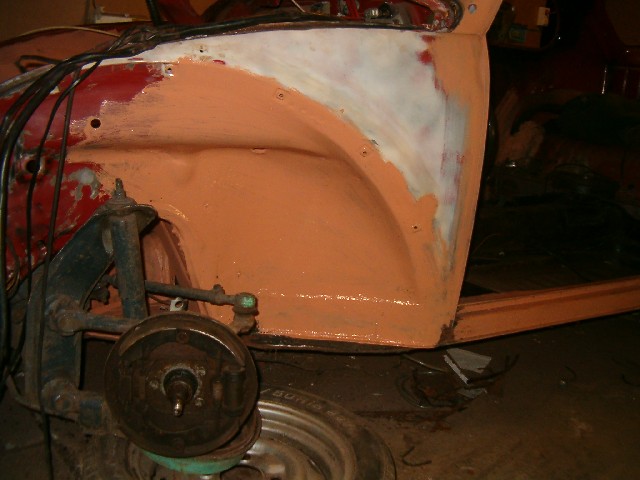 Ook albert is weer verder gegaan met de linkervoorkant! Deze is nu zo goed als klaar. Er moest nog een klein stukje ingelast worden bij één van de moeren waar het spatbord mee vast komt te zitten, daarna is het in de verf gezet en dat lijkt best wel netjes vonden wij. Nu moeten er nog 2 kleine stukjes aan gelast worden en dan is dit gedeelte (op de bandenbak na...) klaar!