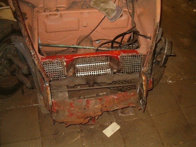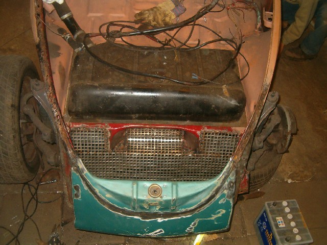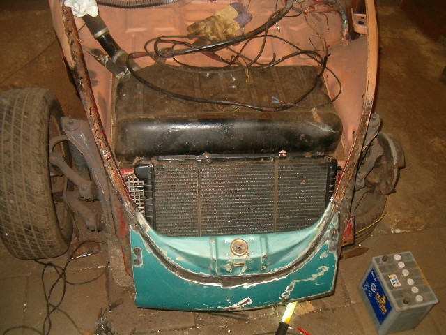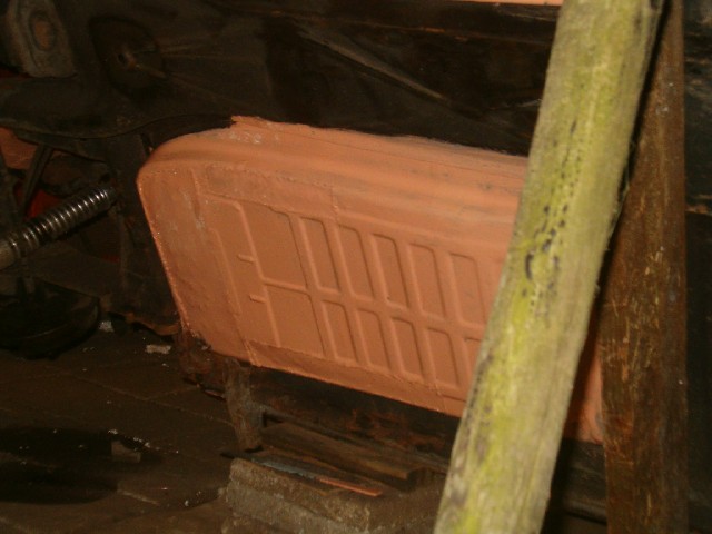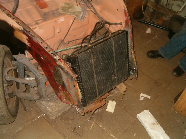Pieter is ook even bezig geweest met de plaatsing van de radiateur, hij heeft de voorkant er uit geflext en alvast wat stukken gaas erin gezet.