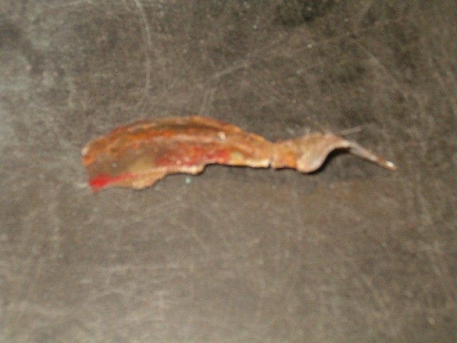 Dit is een van de stukjes die voor weg kwamen, de foto is jammer genoeg niet heel duidelijk. Maar als je goed kijkt kun je de stukken polyster en roest nog wel zien zitten :-(